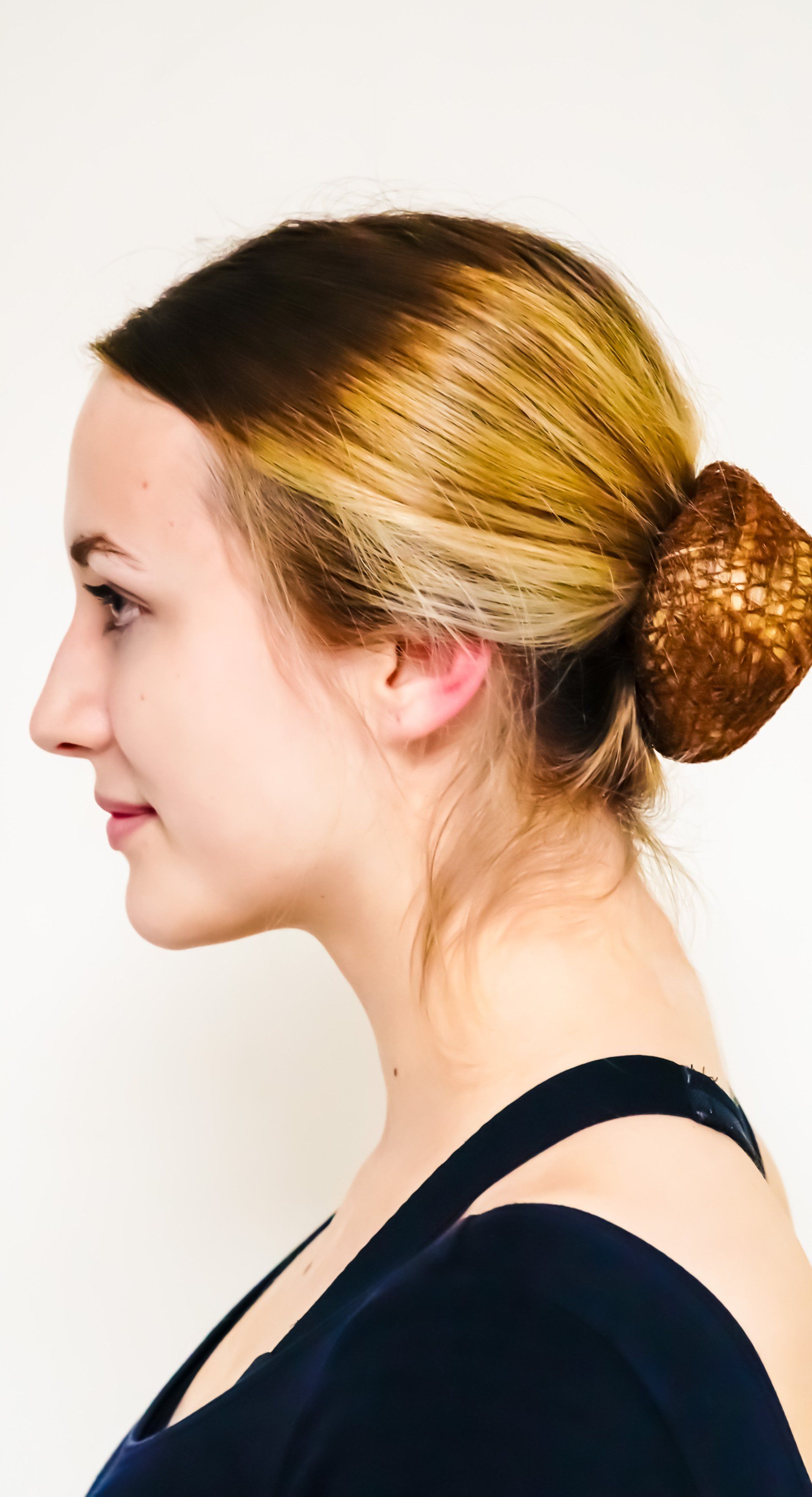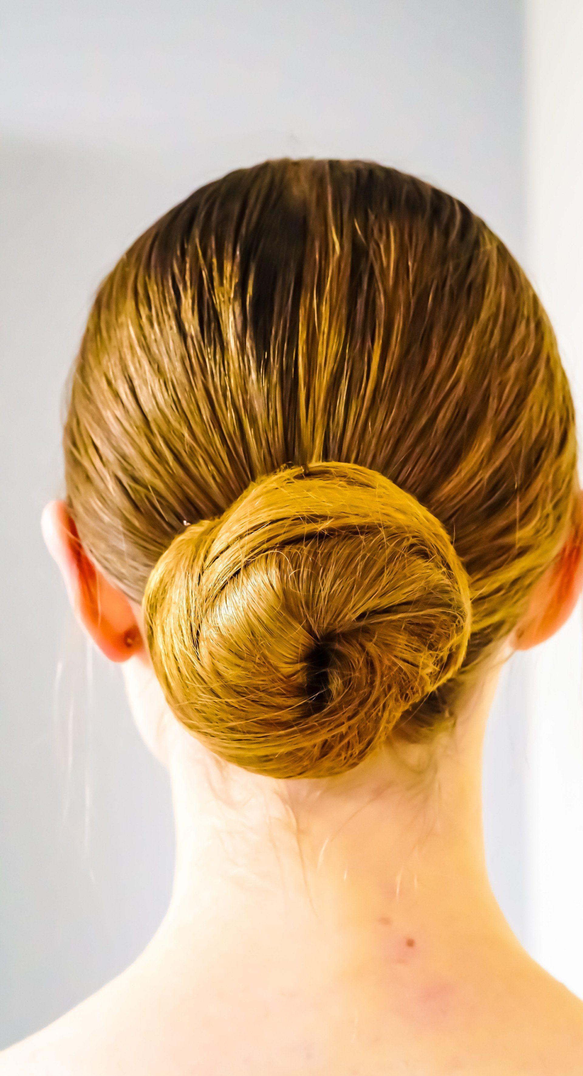 Low bun. - Hair shorter than shoulder length and neckline: Half up, half down, or plaits/braids.